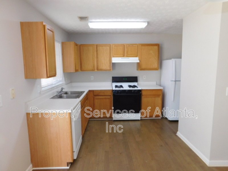 A covered entry gives access on the main level into an open floor plan with a living room, dining area with access to the patio and fenced in yard, to the kitchen with Oak cabinets, Formica counters, refrigerator, gas stove, dishwasher, range hood, panty, half bath and access to the 2-car front entry garage with auto-opener. The upper level features two spare bedrooms, full hall bath with tub/shower combination, master bedroom and master bath with tub/shower combination. Planking flooring - no carpets!! Tenant responsible for maintaining the landscaping within the fenced-in back yard. HOA handles the landscaping for the other areas. Easy access to I-75, close to KSU and downtown Acworth with lots of shopping & dining.